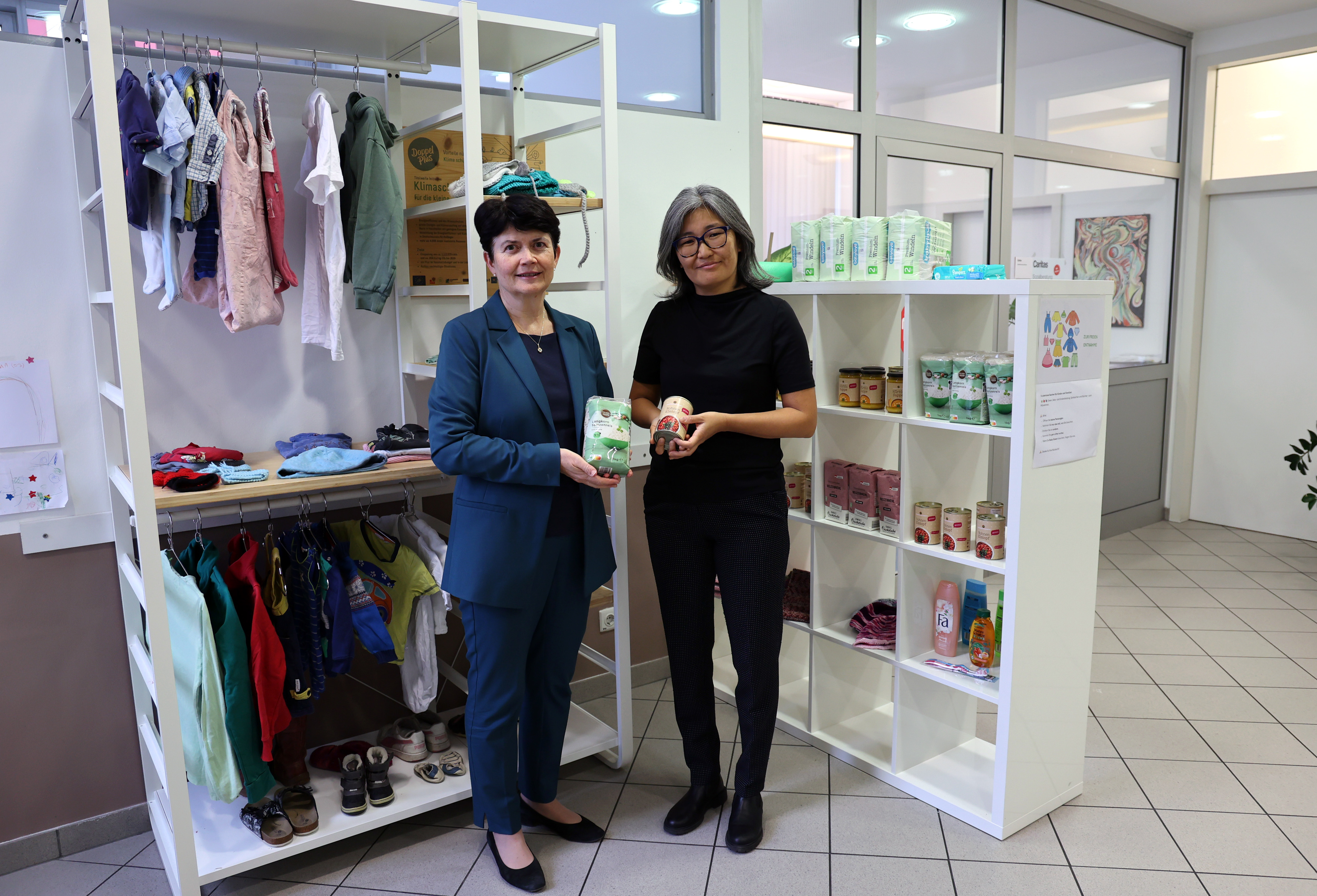 BU: Für viele reicht das Geld für das Grundlegendste nicht mehr. Caritas Direktorin Elisabeth Rathgeb (l.) und Somi Jochum, Leiterin der Caritas-Sozialberatung, informierten über die aktuelle Lage in Tirol und präsentierten ein Regal mit Grundnahrungsmitteln für die Klient*innen der Sozialberatung. (c) Caritas Tirol/D. Giesinger jpg, 2 MB -