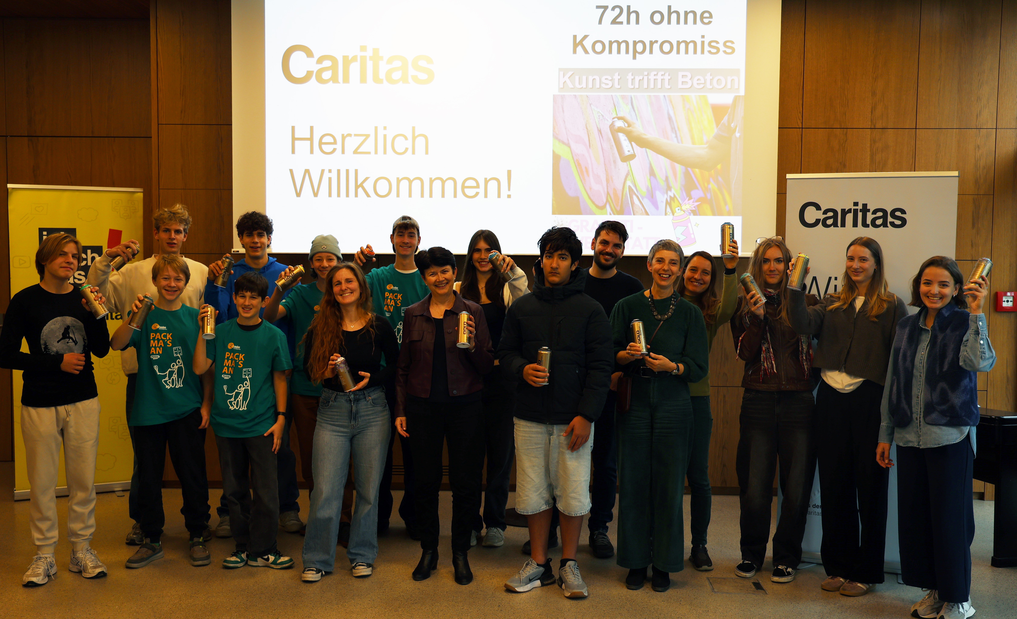 Die Jugendlichen rund um Caritas-Direktorin Elisabeth Rathgeb (5.v.l.) und Organisatorin Romina Hammermann (4.v.l.) freuten sich auf die Spray-Aktion. (c) Caritas Tirol/D. Giesinger jpg, 2 MB -