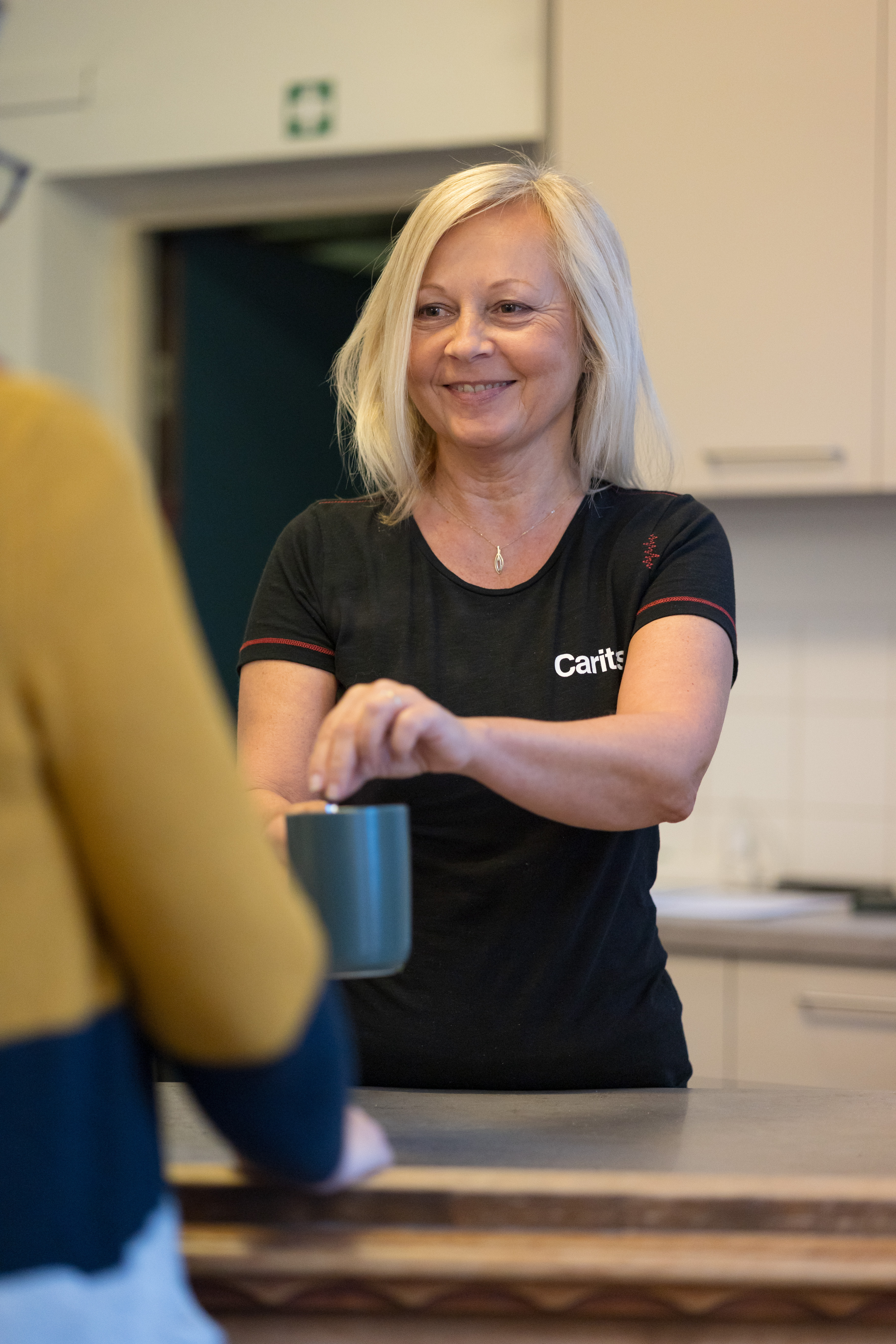 Beim Kaffee ausschenken, trafen sich die Leute, unterhielten sich und spendeten. Margit Stolz und Karin Theurl sammelten für die Caritas Haussammlung. (c) Caritas Tirol jpg, 2 MB -