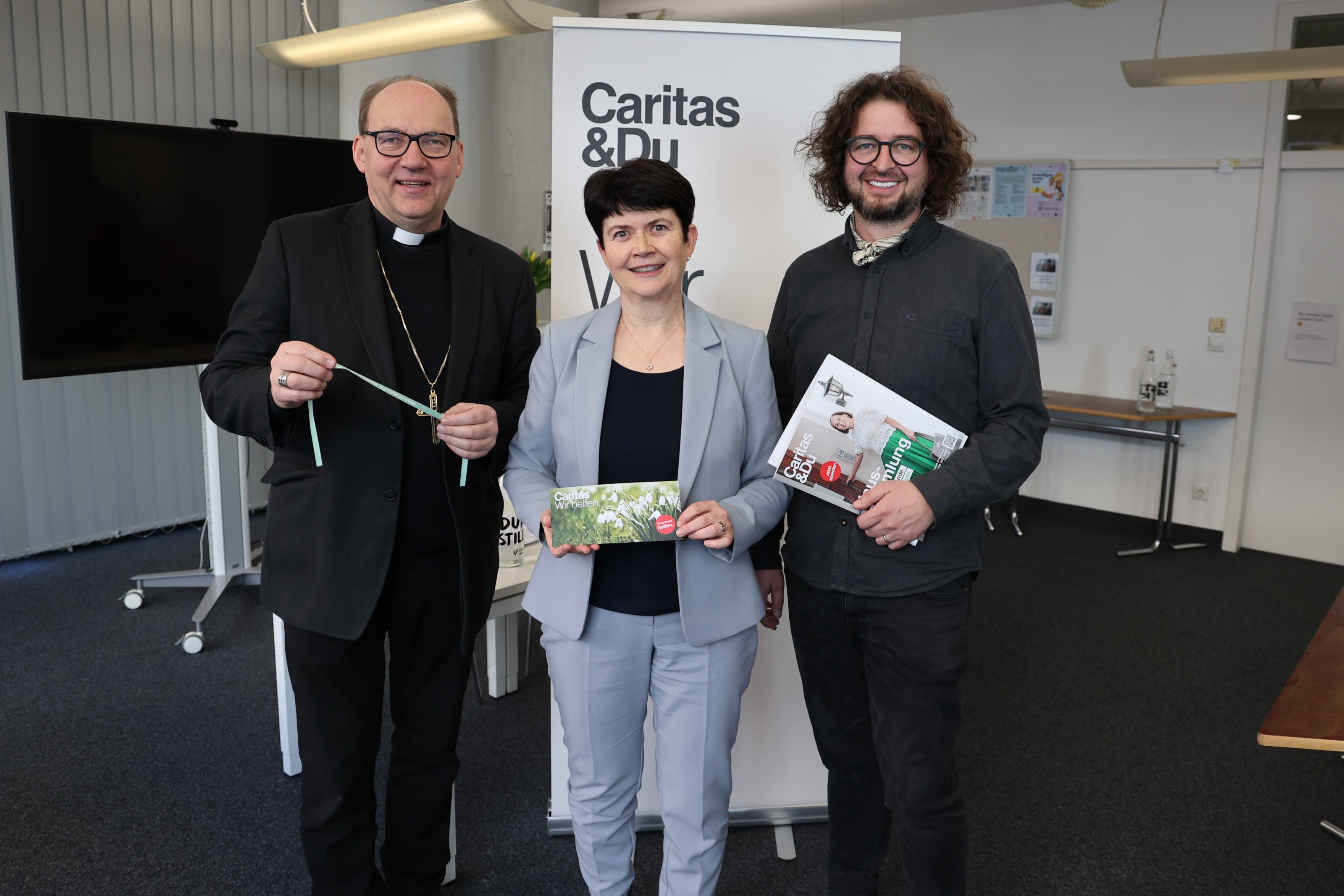 BU: Die Caritas Haussammlung ist eine der bedeutendsten Freiwilligen-Aktionen in der Diözese Innsbruck. Sie läuft den ganzen März. Zum Auftakt gaben Bischof Hermann Glettler, Caritas Direktorin Elisabeth Rathgeb und Diakon Danijel Juric (v.l.) Details bekannt. (C) D. Giesinger/Caritas Tirol jpg, 762 KB -